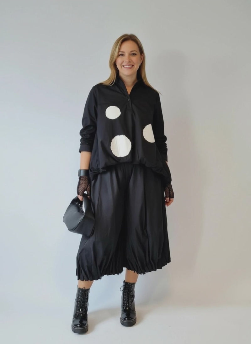 This season, make a statement in this luxurious Jazz Up Maxi Polka Dot Shirt. Featuring a bell shape and ruffled design with bold maxi polka dots, this shirt boasts a loose hem and full length sleeves, finished with an elegant button closure neckline. Exquisite and unique, this piece will add a touch of high-end sophistication to any look.