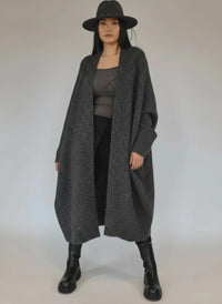 The kind of piece that makes winter feel like style season. This Oversized Knit Cardigan in cool charcoal gray wraps you in a cocoon of comfort while keeping things effortlessly edgy. The long, draped fit creates a striking silhouette, while deep interior pockets make it as practical as it is chic.