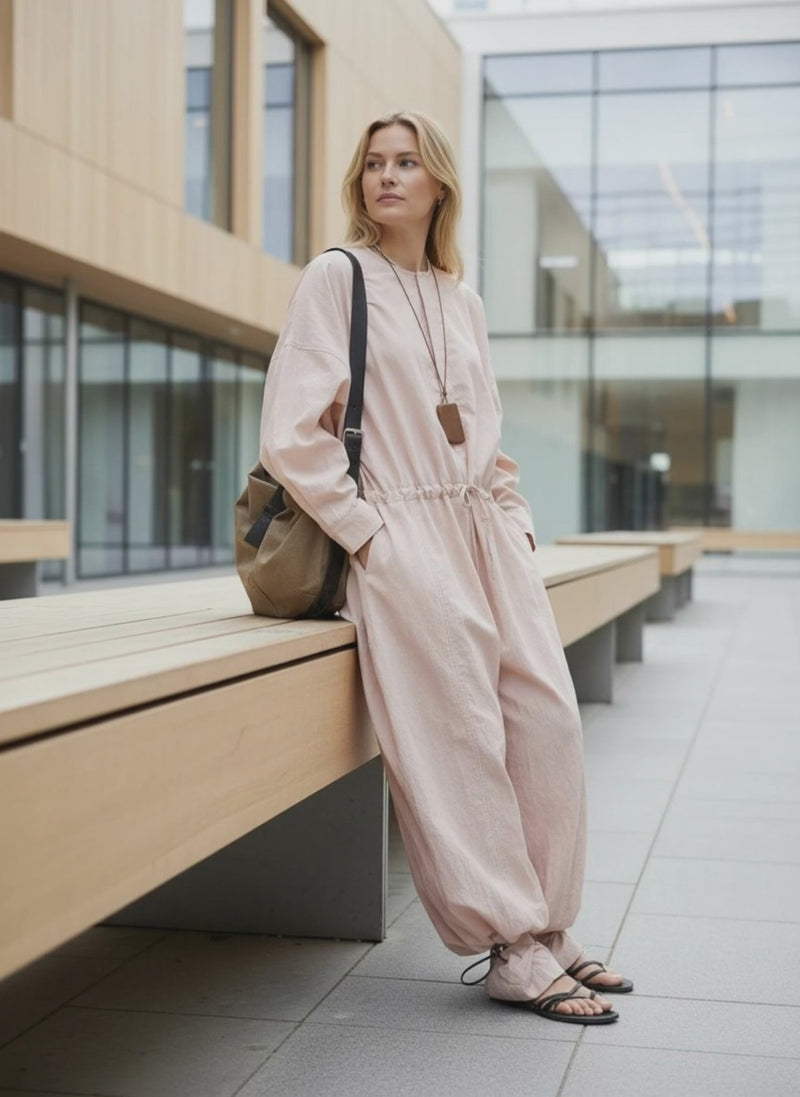 This Oversized Drawstring Jumpsuit brings an airy, lived-in vibe with its wide-leg silhouette, dropped shoulders, and cinched waistline that lets you define the shape your way. Crafted from a lightweight nylon-lyocell blend with a subtle texture, it moves beautifully and layers easily through all seasons.